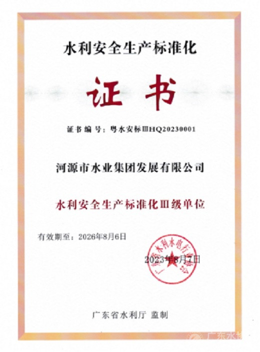河源市水业集团获评广东省水利安全生产标准化三级单位