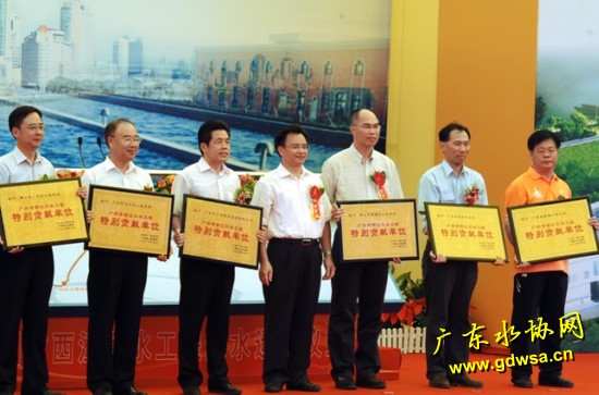 广州市自来水公司经理王建平(右二)颁发“广州市西江引水工程特别贡献单位”奖