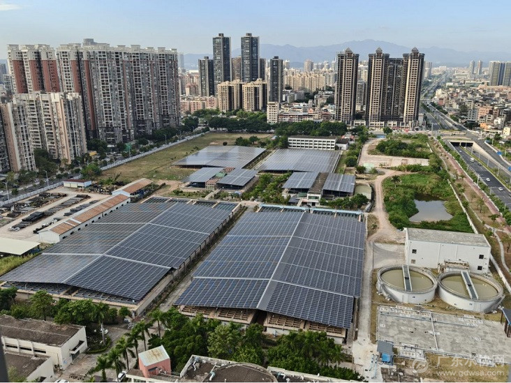 分布式光伏项目的规模化应用则是另一大亮点。站在潼湖水厂、江北水厂办公楼屋顶,放眼望去,一片深蓝色的光伏板在阳光下熠熠生辉。这些板子不仅为水厂遮阳挡雨,更将光能转化为绿色电力。