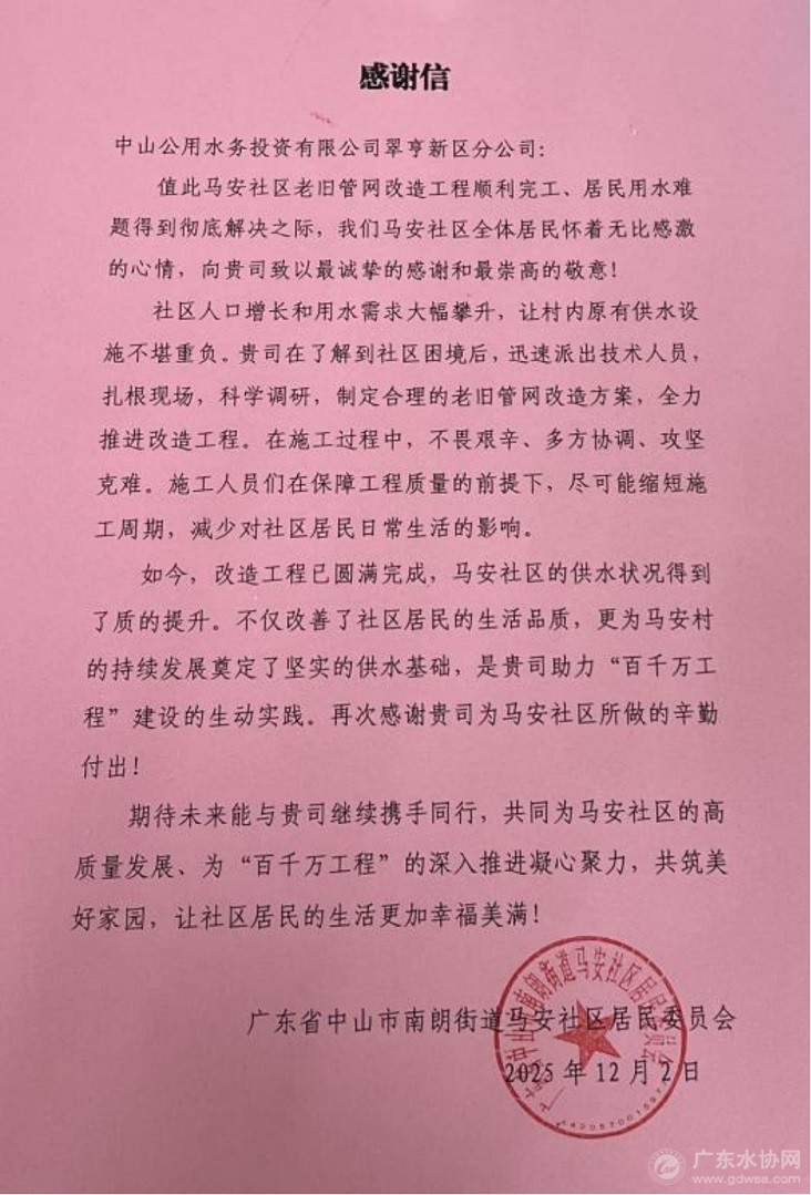 2025年12月2日,中山公用水务翠亨新区分公司(以下简称:公司)收到马安社区居民委员会发来的感谢信。信中写道,在助力“百千万工程”建设的生动实践中,公司急群众之所急,迅速响应“马安社区老旧管网改造”民生需求,以高标准高质量推进工程建设并圆满完工。这不仅是一次管网的 “焕新升级”,更是为居民提供了稳定可靠的供水保障,“百千万工程”服务群众的务实举措。