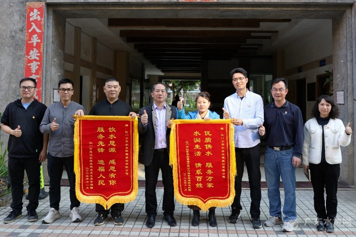 2025年12月17日,江门市怡乐苑业主委员会与物业管理处代表共同将两面印有“优质供水,服务万家;水润生活,情系百姓”和“饮水思源,感恩有你;服务先锋,造福人民”的锦旗送至江门公用水务项目团队手中,以此表达对公司在泵房改造中展现出的为民服务精神与国企担当的诚挚感谢与高度赞誉。