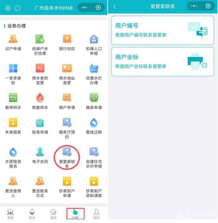 线上办理:通过“广州自来水96968”微信、支付宝小程序、广州自来水APP等渠道足不出户办理各项业务,或可进入【星管家联系】功能,通过“用户编号”或“用户坐标”方式查找您的专属“水管家”。