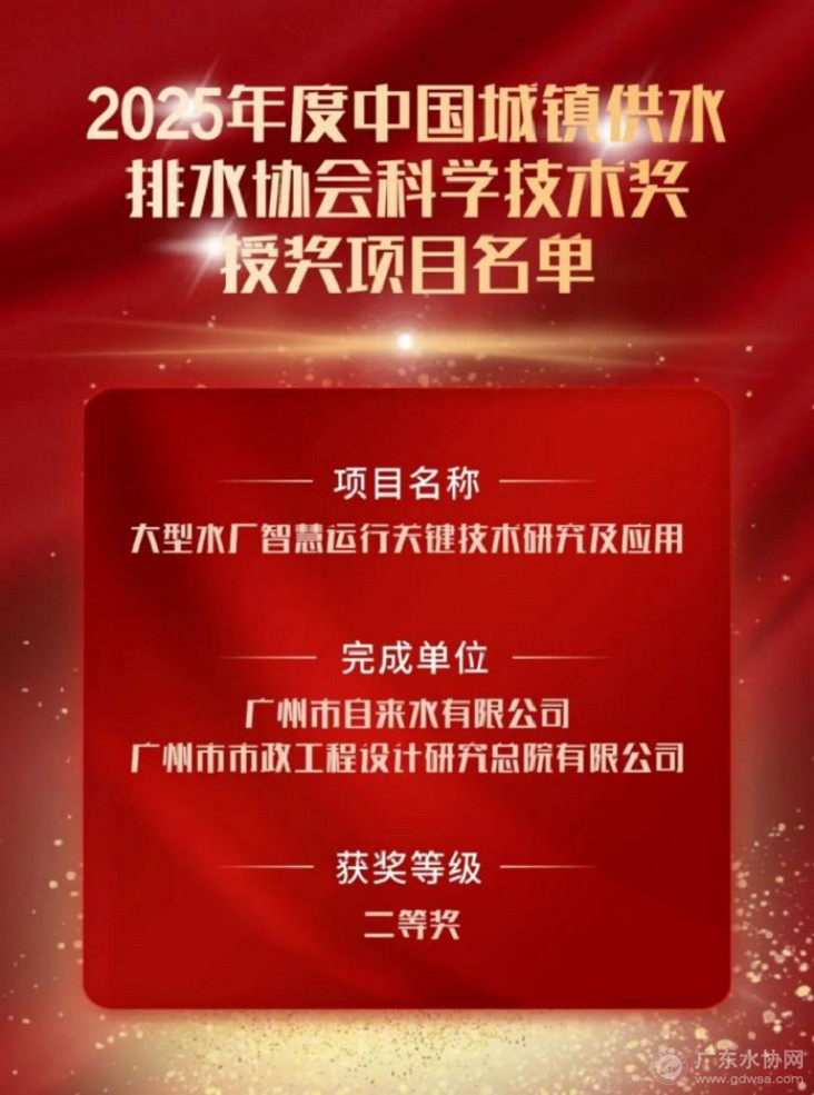 近日,中国城镇供水排水协会(简称“中国水协”)年度科技奖励名单公布,广州水投自来水公司牵头研发的“大型水厂智慧运行关键技术研究及应用”项目,凭借突出的创新价值与实用成效,斩获中国水协科技奖二等奖,标志着公司在水厂智慧化领域的技术实力与成果应用获国家级行业权威认可,跻身行业前列。