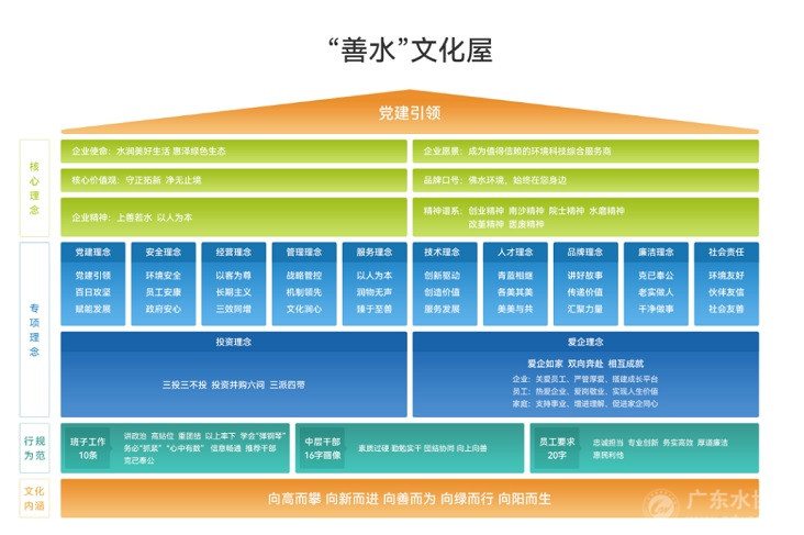 六十余年发展历程中,佛水环境形成了“上善若水,以人为本”的企业精神。2019年起,我们着力打造“善水”文化体系;2025年11月,“善水”文化升级至5.0版本,提炼出“向高而攀、向新而进、向善而为、向绿而行、向阳而生”企业文化内涵,凝练形成七大精神谱系,并首次建立分层分类的行为指引体系,让“善水”文化可感知、可践行。