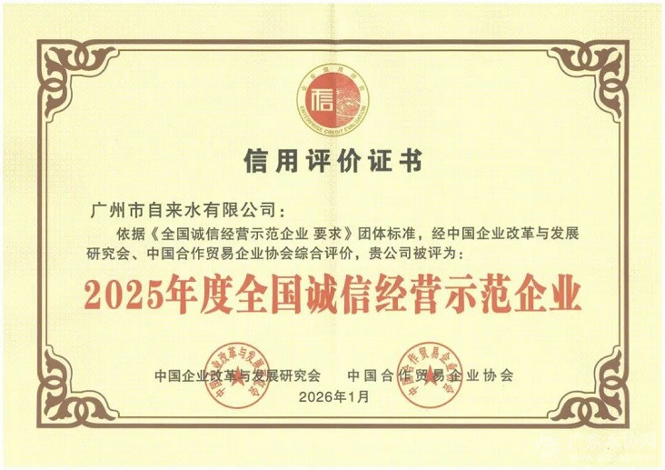 广州水投自来水公司荣获全国诚信经营示范企业称号