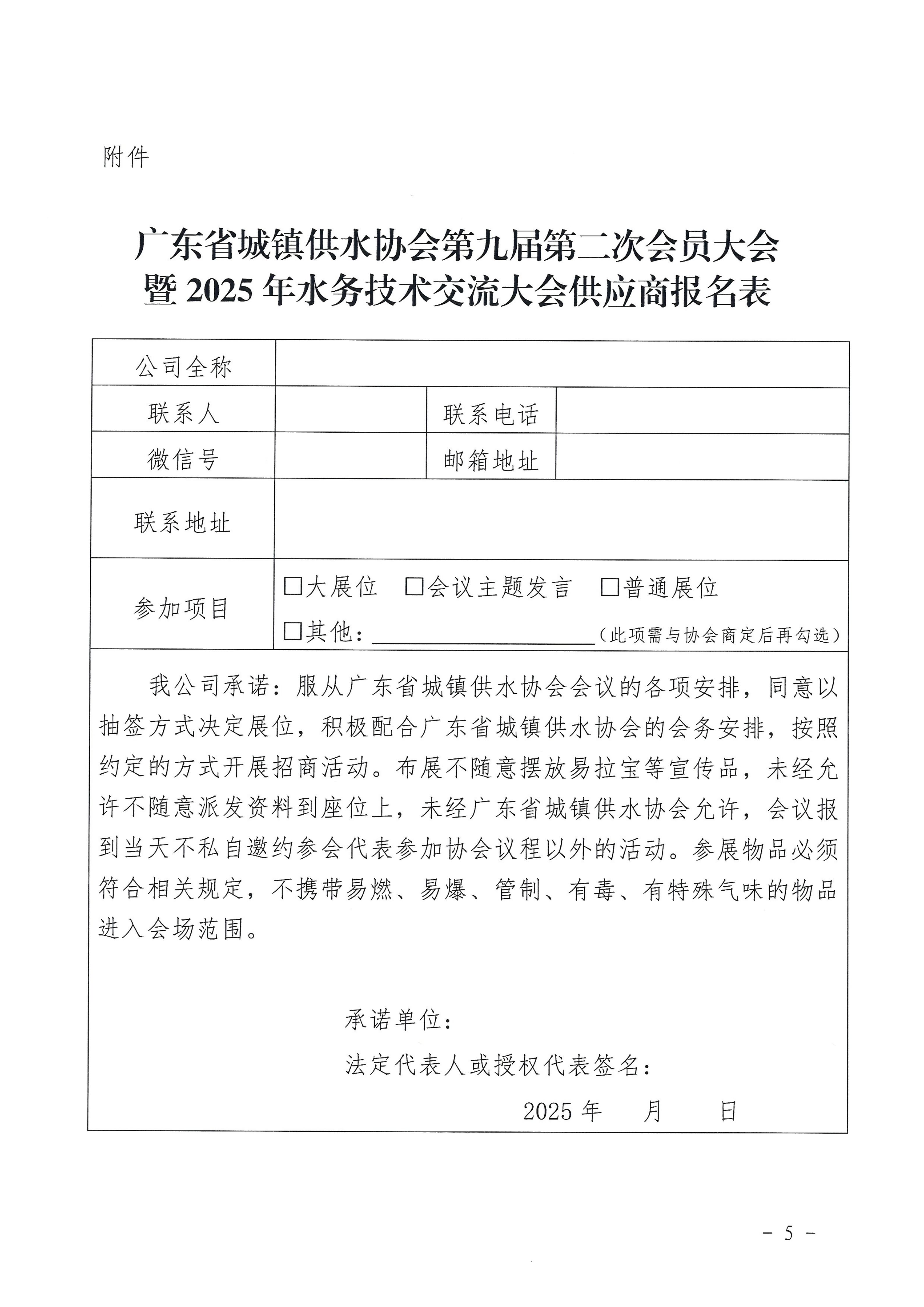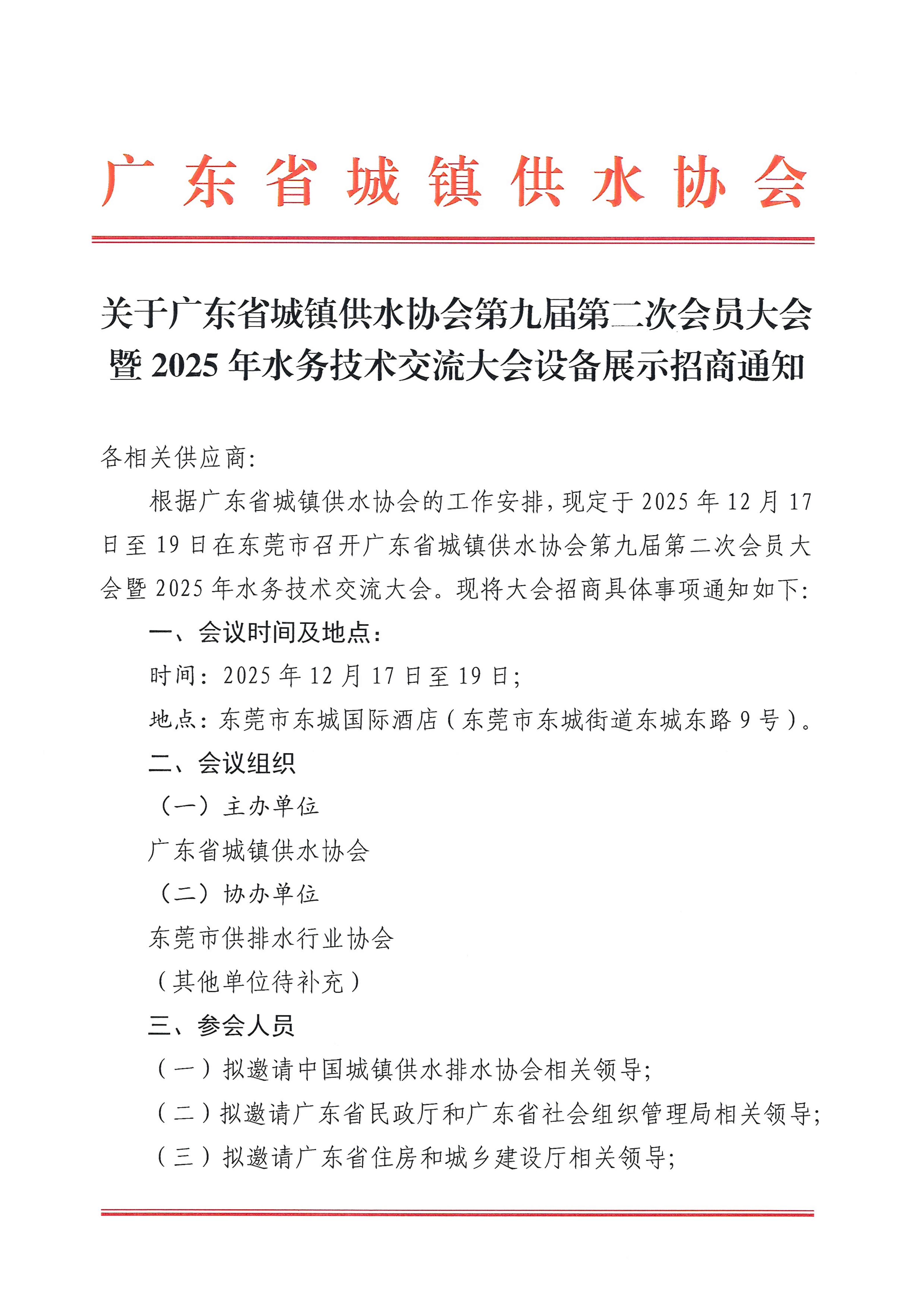 | 文件名称: | 关于广东省城镇供水协会第九届第二次会员大会暨2025年水务技术交流大会设备展示招商通知 | ||