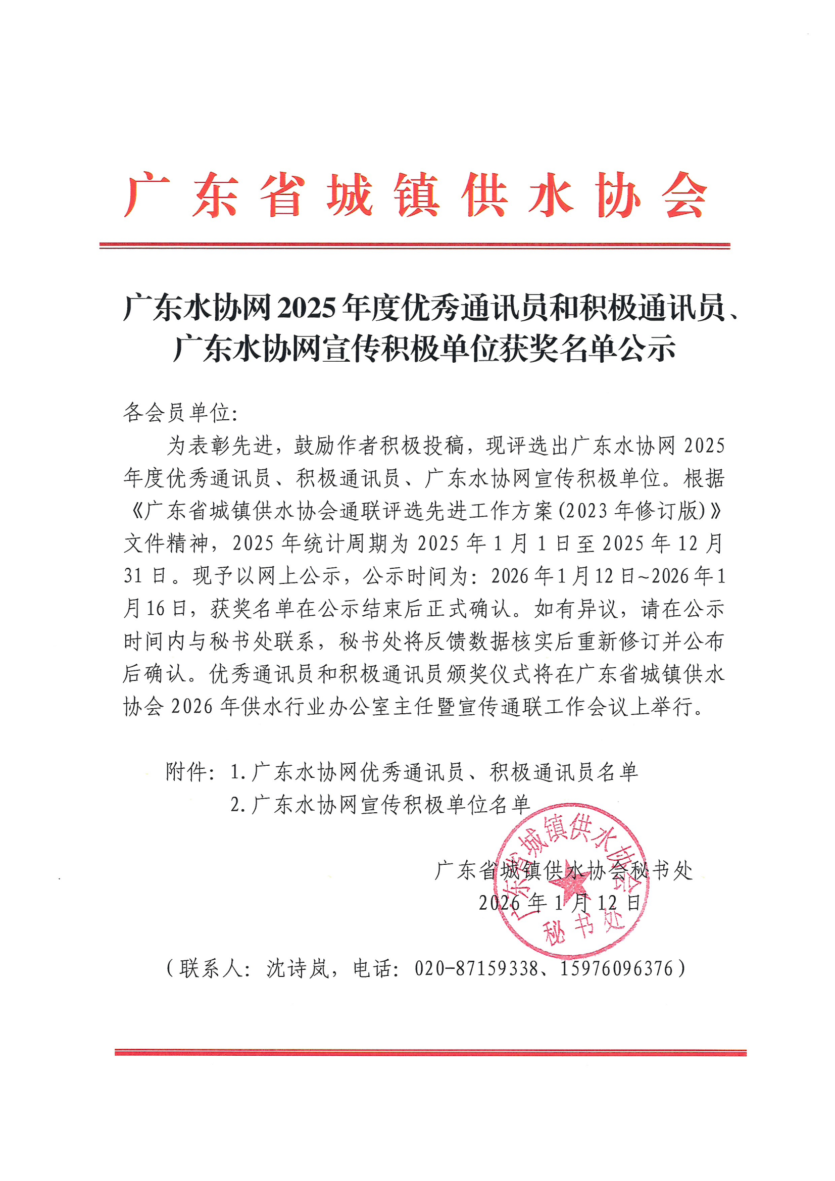 | 文件名称: | 广东水协网2025年度优秀通讯员和积极通讯员、广东水协网宣传积极单位获奖单位公示 | ||